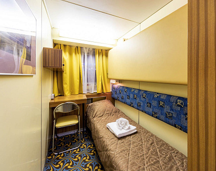 В каюте: два спальных места (одно над другим), шкаф для одежды, зеркало, радио, душ, санузел, холодильник, кондиционер, обзорное окно, электророзетка на 220V.