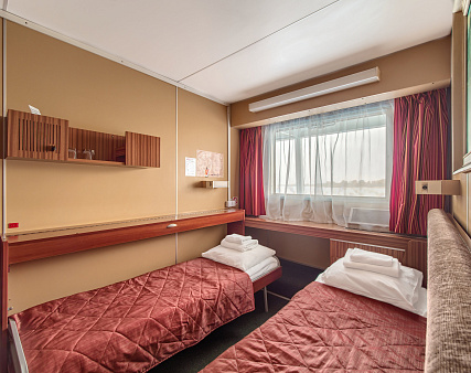 В каюте: четыре спальных места (два внизу, два вторым ярусом), шкаф для одежды, холодильник, кондиционер, радио, два обзорных окна, электророзетка на 220V.
