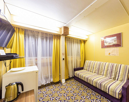 В каюте: односпальная кровать, диван, раскладывающийся на двух человек, шкаф для одежды, журнальный столик,телевизор с DVD, кондиционер, холодильник, радио, два обзорных окна, электророзетка на 220V.