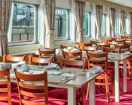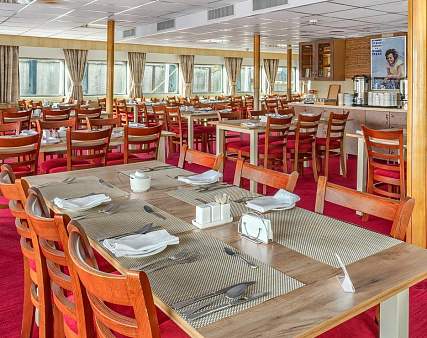 - Завтрак — шведский стол или заказная система с элементами шведского стола, фиксированная рассадка. Включённые напитки (без ограничения): вода, сок, чай, кофе. В рейсах до 4-х дней при ранней высадке в день прибытия завтрак континентальный;
