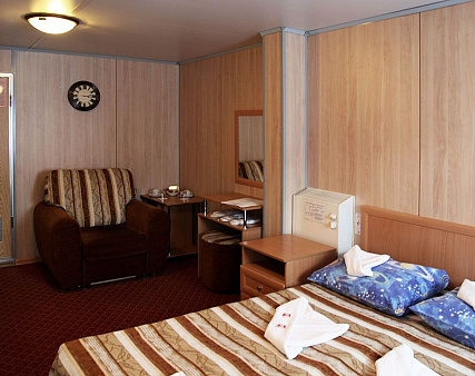 В каюте: двуспальная кровать 160х200 см (кровати раздвигаются), кресло-кровать, шкаф для одежды, пуфик, журнальный стол, трюмо, телевизор с DVD, холодильник, радио, фен, два обзорных окна, электророзетка на 220V.