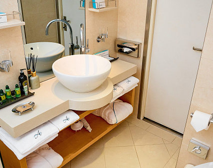 В каюте: кровать и диван (расположены буквой Г), кондиционер, гардероб, телевизор, телефон, фен, сейф, халаты, увлажнитель воздуха. Ванная комната с душем и туалетом.