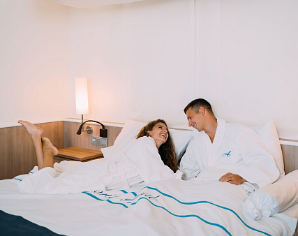 В каюте: одна двуспальная кровать, кондиционер, гардероб, телевизор, телефон, фен, сейф, халаты, увлажнитель воздуха. Ванная комната с душем и туалетом.