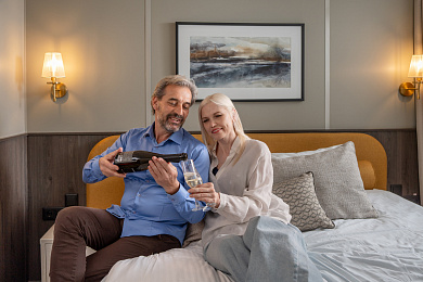 Комфортабельная комната с современным интерьером. Удобства: диван (раскладывается), телевизор, двуспальная кровать (кровати раздвигаются), прикроватные тумбы, письменный стол, холодильник, книжный стеллаж, журнальный столик, пуф, шкаф для одежды, мини-бар, 4 розетки на 220V, две розетки USB, фен. Размер кровати — 175х210 см. В каюте возможно 3-местное размещение.