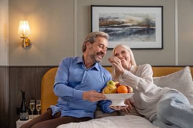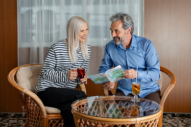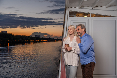 - Ужин – заказная система питания (выбор блюд со 2-го дня круиза), фиксированная рассадка. Включённые напитки (без ограничения): вода, чай, кофе. На выбор: вино красное / белое / игристое (1 бокал, 125 мл) / водка (1 рюмка, 50 мл) / пиво (1 бокал, 300 мл) / домашний морс (1 бокал, 200 мл). По запросу гостя: кисломолочный напиток (1 стакан, 200 мл).