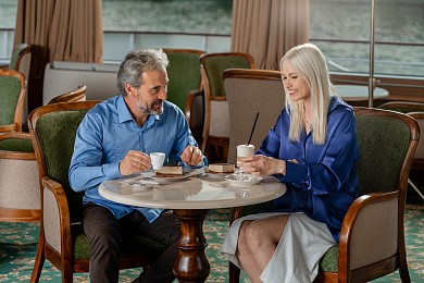 - Обед – заказная система питания (выбор блюд со 2-го дня круиза). Включенные напитки (без ограничения): чай, кофе. Фиксированная рассадка;