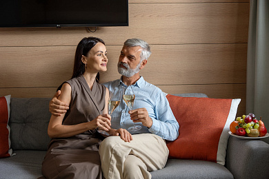 • Ужин — заказная система питания, фиксированная рассадка. Включённые напитки (без ограничения): вода, чай, кофе, домашний морс. На выбор: вино красное / белое / игристое (1 бокал, 125 мл) / водка (1 рюмка 50 мл) / пиво (1 бокал, 300 мл) / лимонад в стекле (бутылка 0,33 + стакан) / cок яблочный / апельсиновый (1 стакан, 200мл) / кисломолочный напиток (200 мл).