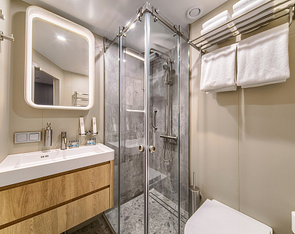 Просторная и комфортабельная каюта на теплоходе с большой, светлой ванной комнатой, балконом и всем необходимым для отдыха