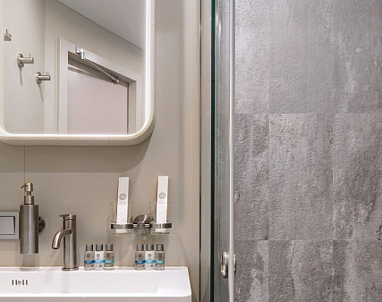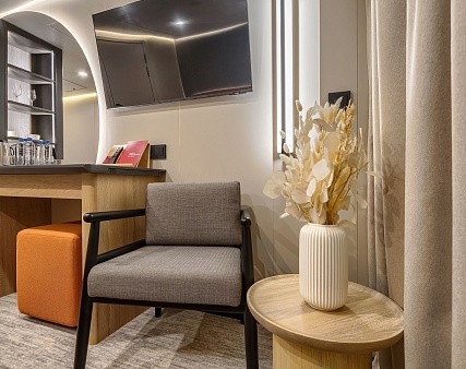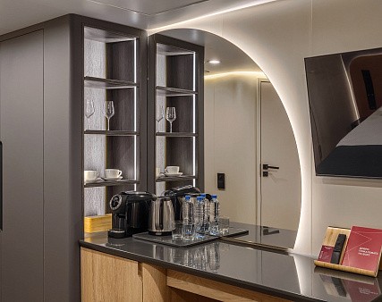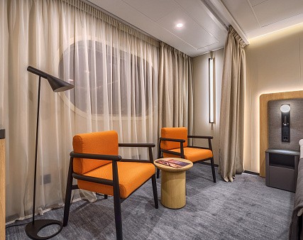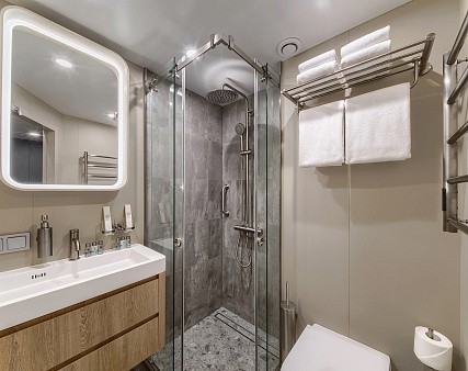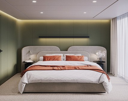 В каюте: двуспальная кровать (раздвигается), прикроватные тумбы, окно (не открывается), кресло, журнальный столик, письменный стол, шкаф для одежды, кондиционер, спутниковое ТВ, холодильник, розетки 220V, телефон, радио, фен, капсульная кофемашина, электрочайник, сейф, душ, санузел. Каждый номер оборудован межкомнатной звукоизоляционной дверью и оснащен качественной функциональной мебелью и современной бытовой техникой. Площадь 18,23 м2