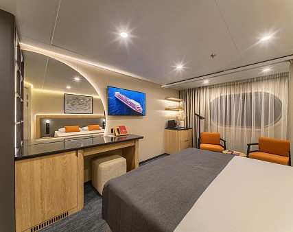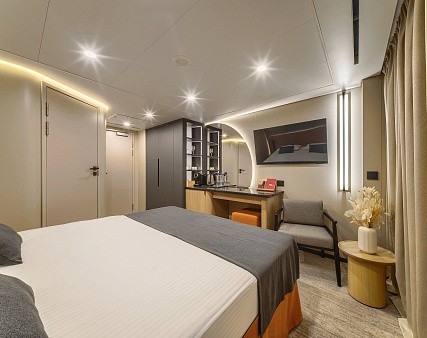 В каюте: двуспальная кровать (раздвигается), прикроватные тумбы, окно (не открывается), кресло, журнальный столик, письменный стол, шкаф для одежды, кондиционер, спутниковое ТВ, холодильник, розетки 220V, телефон, радио, фен, капсульная кофемашина, электрочайник, сейф, душ, санузел. Площадь до 18,23 м2