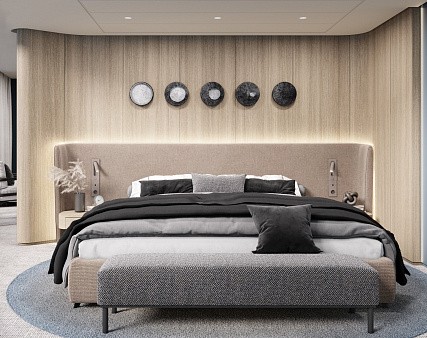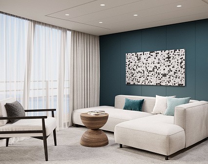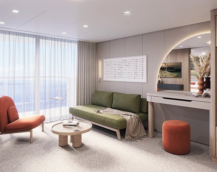 Балкон: два кресла, кофейный столикВ каюте: двуспальная кровать, прикроватные тумбы, журнальный столик, письменный стол, гардероб диван, кресло, панорамные окна, спутниковое ТВ, шкаф для одежды, холодильник, кондиционер, розетки 220V, телефон, радио, фен, капсульная кофемашина, электрочайник, cейф, душ, санузел. Панорамный балкон: два кресла, кофейный столик.