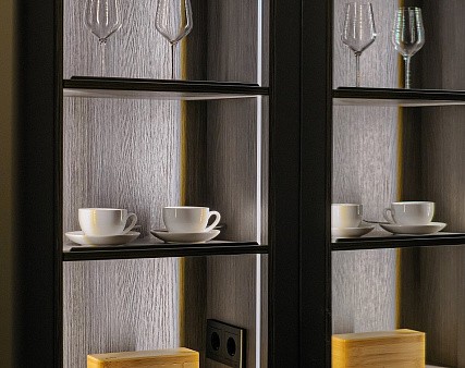 В гостиной: диван, кресло, журнальный столик, холодильник, спутниковое ТВ, пуф, шкаф для одежды, розетки 220V, телефон, радио, фен, капсульная кофемашина, электрочайник, сейф, балкон.