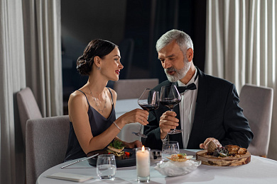 - Ужин — заказная система питания, фиксированная рассадка. Включённые напитки (без ограничения): вода, чай, кофе, домашний морс. На выбор: вино красное / белое / игристое (1 бокал, 125 мл) / водка (1 рюмка 50 мл) / пиво (1 бокал, 300 мл) / лимонад в стекле (бутылка 0,33 + стакан) / cок яблочный / апельсиновый (1 стакан, 200мл) / кисломолочный напиток (200 мл).