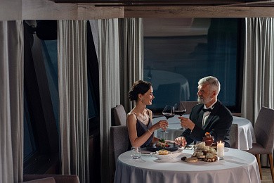 • Ужин — заказная система питания, фиксированная рассадка. Включённые напитки (без ограничения): вода, чай, кофе, домашний морс. На выбор: вино красное / белое / игристое (1 бокал, 125 мл) / водка (1 рюмка 50 мл) / пиво (1 бокал, 300 мл) / лимонад в стекле (бутылка 0,33 + стакан) / cок яблочный / апельсиновый (1 стакан, 200мл) / кисломолочный напиток (200 мл).