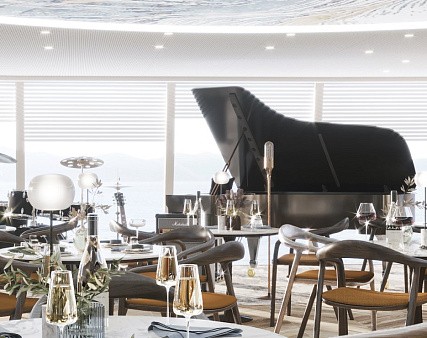 В каюте: двуспальная кровать, прикроватные тумбы, журнальный столик, письменный стол, гардероб диван, кресло, панорамные окна, спутниковое ТВ, шкаф для одежды, холодильник, кондиционер, розетки 220V, телефон, радио, фен, капсульная кофемашина, электрочайник, cейф, душ, санузел. Панорамный балкон: два кресла, кофейный столик.