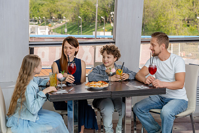 - Ужин — заказная система питания (выбор блюд со 2-го дня круиза). Включённые напитки (без ограничения): вода, чай, кофе, кисломолочный напиток (1 стакан 200 мл на ужин по запросу гостя). На выбор: вино красное / белое / игристое (1 бокал, 125 мл) / водка (1 рюмка, 50 мл) / пиво (1 бокал, 300 мл), домашний морс (1 бокал, 200 мл);