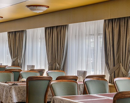 - Ужин — заказная система питания (выбор блюд со 2-го дня круиза). Включённые напитки (без ограничения): вода, чай, кофе, кисломолочный напиток (1 стакан 200 мл. на ужин по запросу гостя).