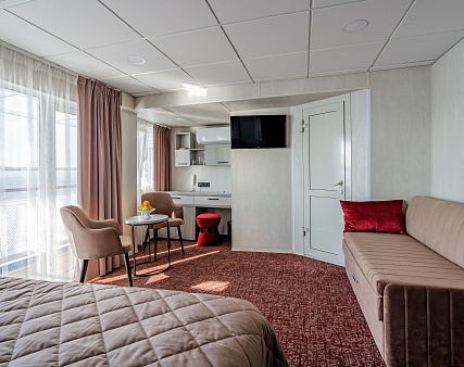 В каюте: одна двуспальная кровать (при необходимости трансформируется в две односпальные кровати), односпальный диван, ванная комната (раковина, душевая кабина, туалет), прикроватные тумбы, стол, зеркало, кресло, журнальный стол, настенная полка, шкаф для одежды, вешалка для верхней одежды, холодильник, телевизор с кабельным и спутниковым вещанием, радио, телефон внутренней связи, кондиционер, сейф, фен, розетки 220V, три обзорных окна.