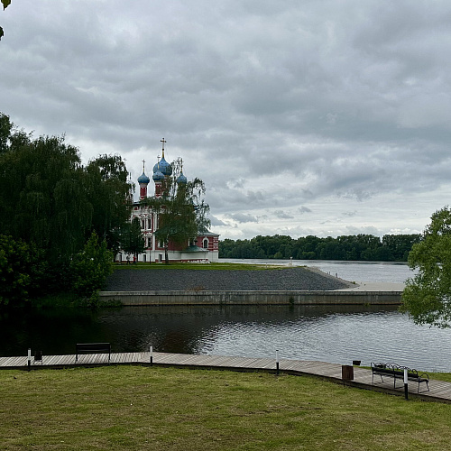 С борта теплохода открывается изумительная панорама Угличского кремля: знаменитая церковь Дмитрия «на Крови», величественный пятиглавый Спасо-Преображенский собор с колокольней.