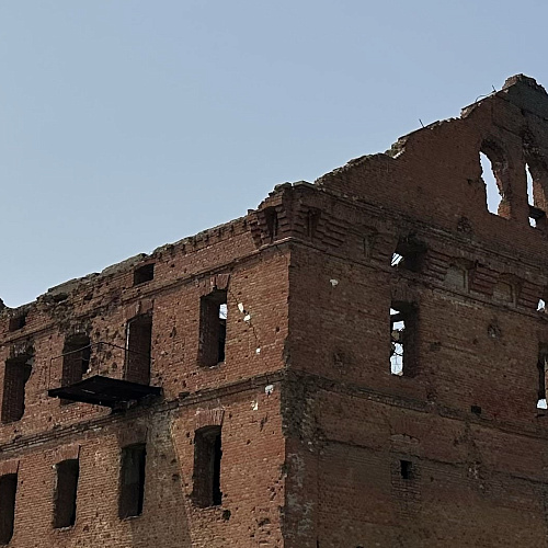 Здание, напоминающее о Сталинградской битве. Его восстановили после войны, но оставили мемориальную стену. В доме находился стратегический наблюдательный пункт, поэтому его постоянно обстреливали. Несмотря на это немецкие войска так и не смогли захватить здание.