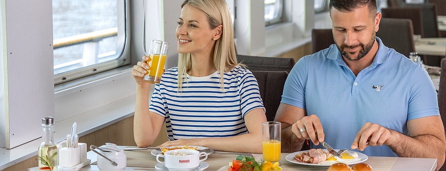 - Завтрак: шведский стол или заказная система с элементами шведского стола. Включены напитки без ограничения: вода, сок, чай, кофе. В рейсах до 4-х дней при ранней высадке в день прибытия завтрак континентальный;