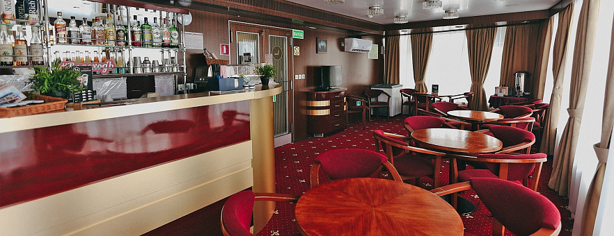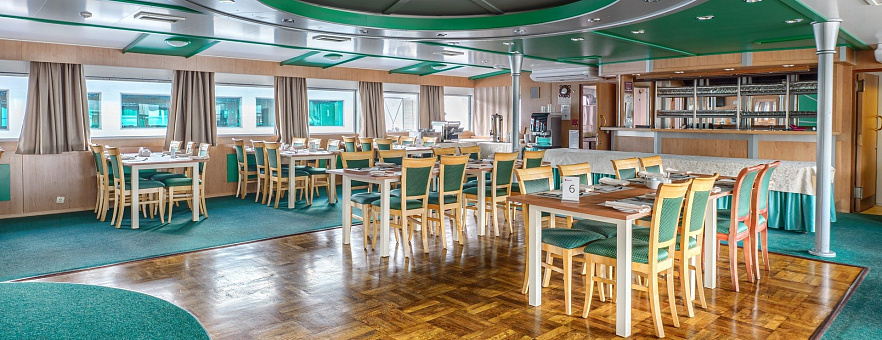 - Ужин — заказная система питания (выбор блюд со 2-го дня круиза). Включённые напитки (без ограничения): вода, чай, кофе, кисломолочный напиток (1 стакан 200 мл на ужин по запросу гостя). На выбор: вино красное / белое / игристое (1 бокал, 125 мл) / водка (1 рюмка, 50 мл) / пиво (1 бокал, 300 мл), домашний морс (1 бокал, 200 мл);