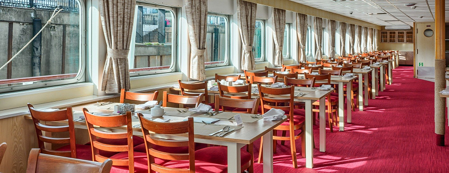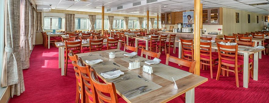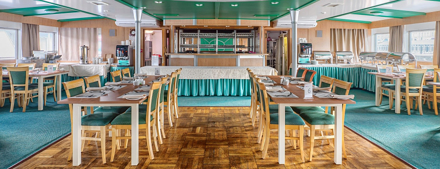 - Завтрак — шведский стол или заказная система с элементами шведского стола, фиксированная рассадка. Включённые напитки (без ограничения): вода, сок, чай, кофе. В рейсах до 4-х дней при ранней высадке в день прибытия завтрак континентальный;