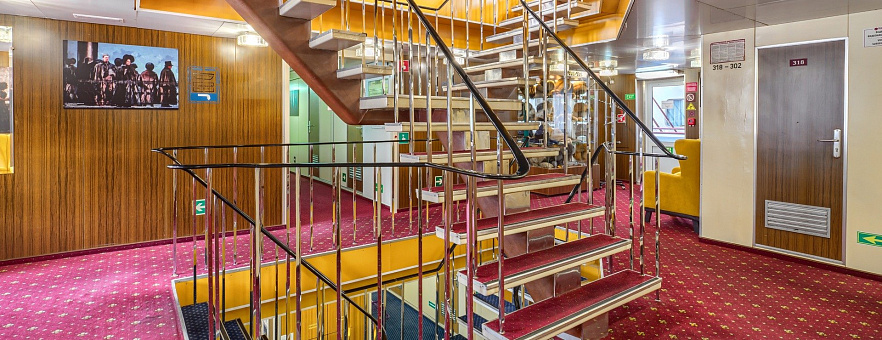 В каютах класса «Полулюкс» дополнительно: холодильник, телевизор и фен.