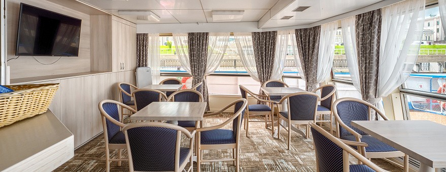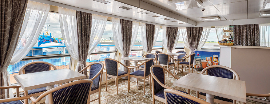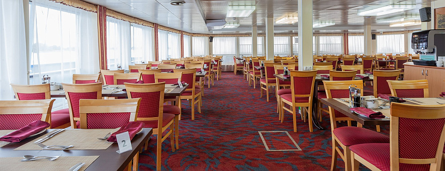 - Завтрак — шведский стол или заказная система с элементами шведского стола, фиксированная рассадка. Включённые напитки (без ограничения): вода, сок, чай, кофе. В рейсах до 4-х дней при ранней высадке в день прибытия завтрак континентальный;