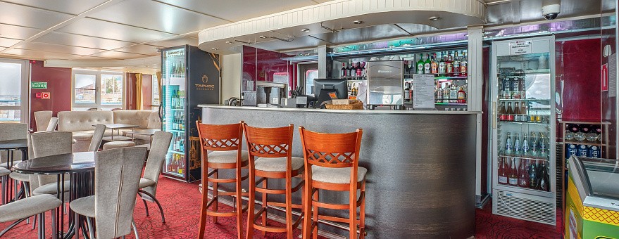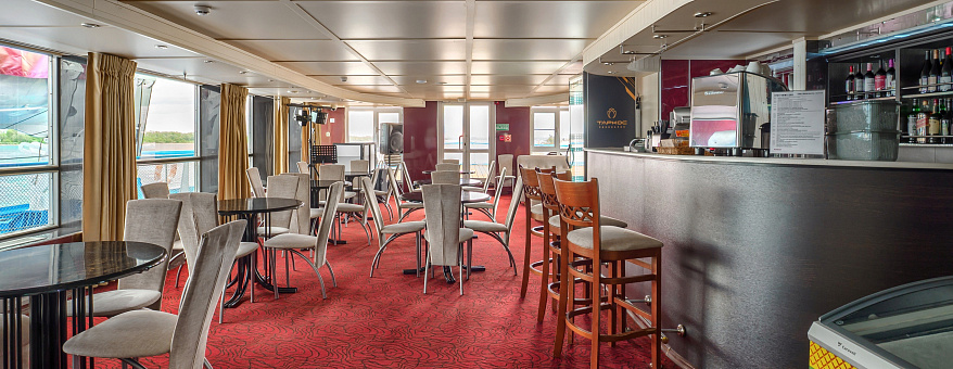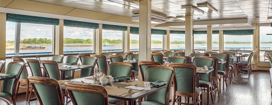 - Ужин — заказная система питания (выбор блюд со 2-го дня круиза). Включённые напитки (без ограничения): вода, чай, кофе, кисломолочный напиток (1 стакан 200 мл на ужин по запросу гостя). На выбор: вино красное / белое / игристое (1 бокал, 125 мл) / водка (1 рюмка, 50 мл) / пиво (1 бокал, 300 мл), домашний морс (1 бокал, 200 мл);