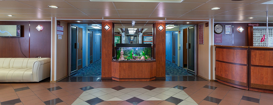 В каюте: два спальных места (одно над другим), шкаф для одежды, зеркало, радио, душ, санузел, кондиционер, обзорное окно, электророзетка на 220V.