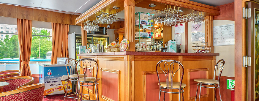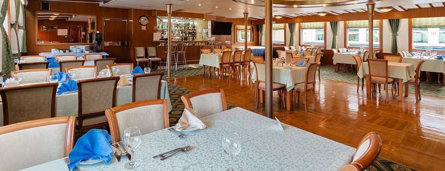- Ужин — заказная система питания (выбор блюд со 2-го дня круиза). Включённые напитки (без ограничения): вода, чай, кофе, кисломолочный напиток (1 стакан 200 мл на ужин по запросу гостя). На выбор: вино красное / белое / игристое (1 бокал, 125 мл) / водка (1 рюмка, 50 мл) / пиво (1 бокал, 300 мл), домашний морс (1 бокал, 200 мл);