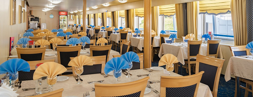 - Завтрак — шведский стол или заказная система с элементами шведского стола, фиксированная рассадка. Включённые напитки (без ограничения): вода, сок, чай, кофе. В рейсах до 4-х дней при ранней высадке в день прибытия завтрак континентальный;