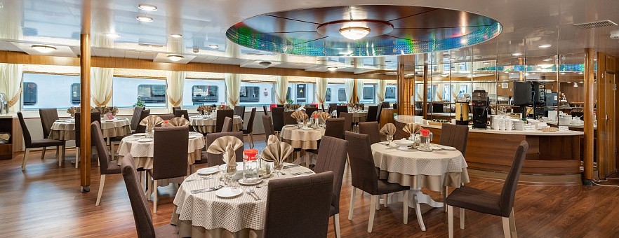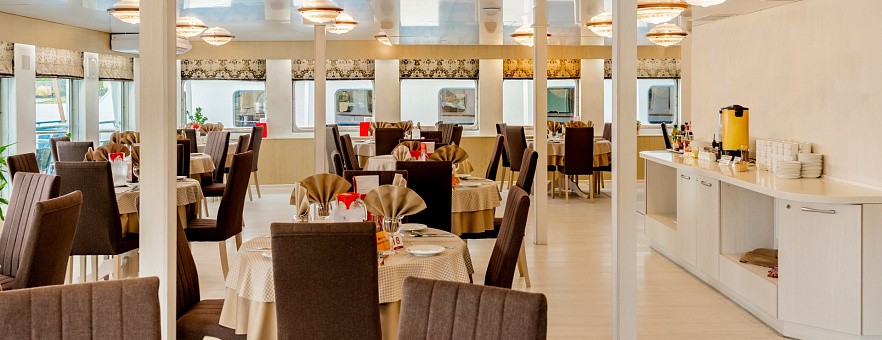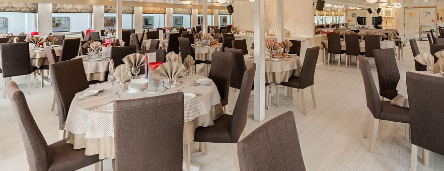 - Полный пансион (завтрак + обед + ужин): завтрак — шведский стол или заказная система с элементами шведского стола, фиксированная рассадка. Включённые напитки (без ограничения): вода*, сок, чай, кофе; обед — заказная система питания (выбор блюд со 2-го дня круиза), фиксированная рассадка. Включённые напитки (без ограничения): вода*, чай, кофе, морс (порционно); ужин — заказная система питания (выбор блюд со 2-го дня круиза), фиксированная рассадка. Включённые напитки (без ограничения): вода*, чай, кофе, кисломолочный продукт (1 стакан, 200 мл); порционно на выбор - вино красное / белое / игристое (1 бокал, 125 мл) / водка (1 рюмка, 50 мл) / пиво (1 бокал, 300 мл) / домашний морс (1 бокал, 200 мл).