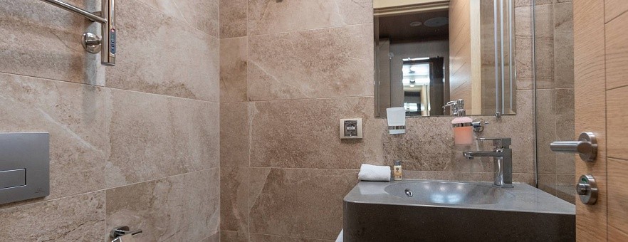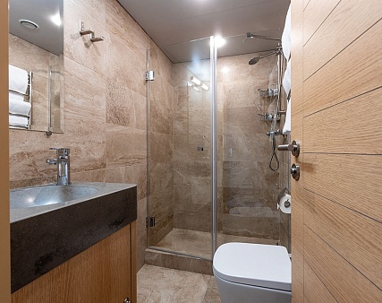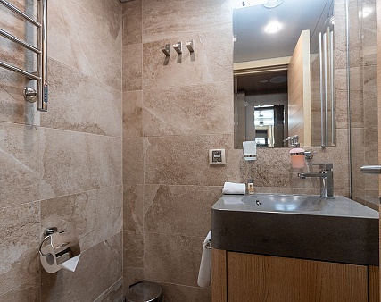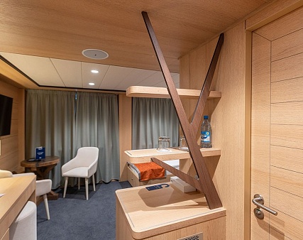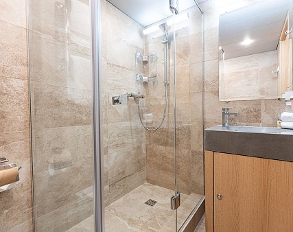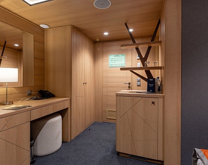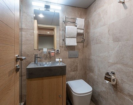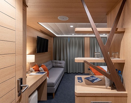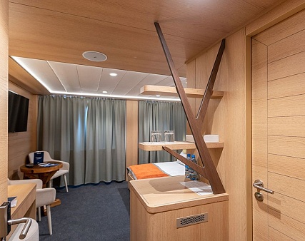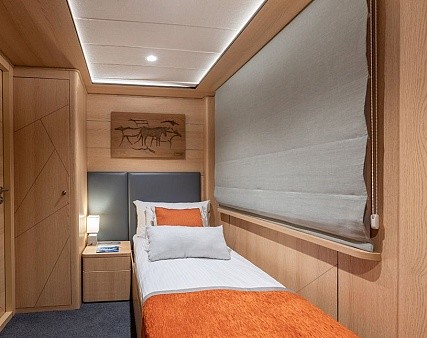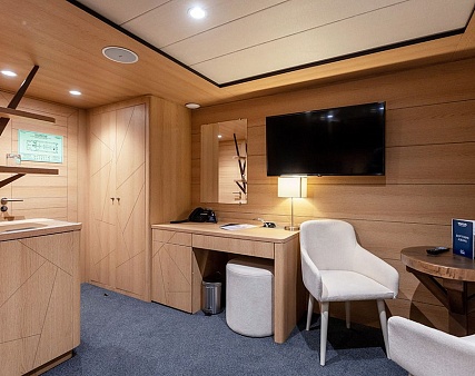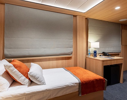 Площадь — 17,7 м2. Однокомнатная каюта с удобствами (душ, санузел, кондиционер) рассчитана на размещение до трех человек.