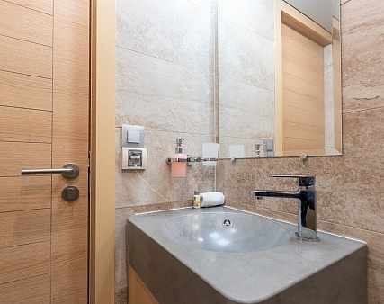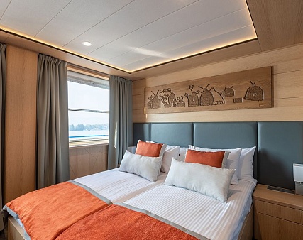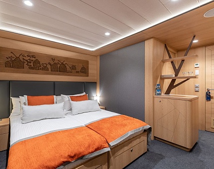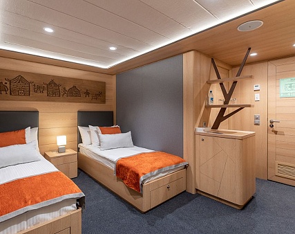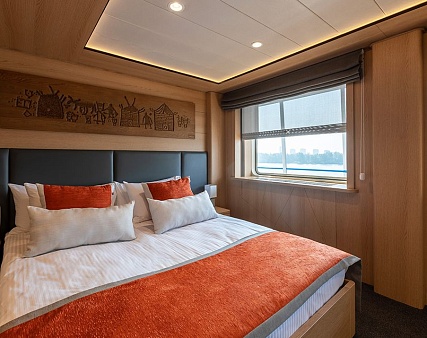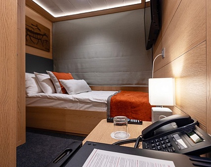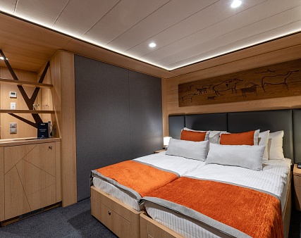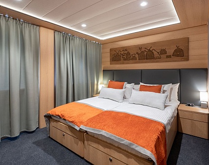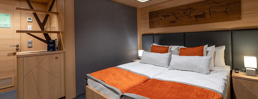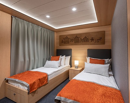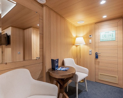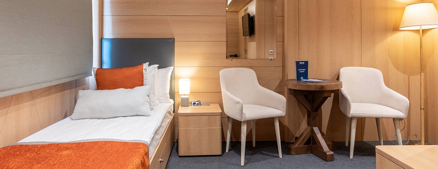 Площадь 12,5 м2. Однокомнатная каюта с удобствами (душ, санузел, кондиционер) рассчитана на размещение до двух человек.