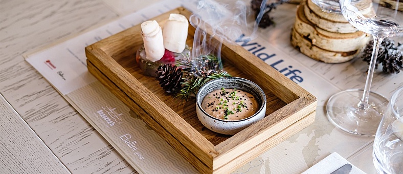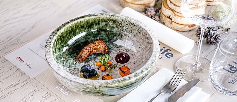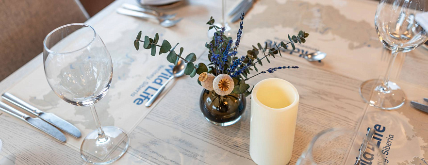 - Ужин – заказная система с включенными напитками (вода, чай, кофе, домашний морс, пиво) без ограничения и сибирскими настойками на аперитив (2 шота), фиксированная рассадка;