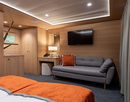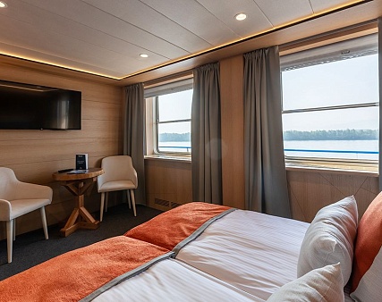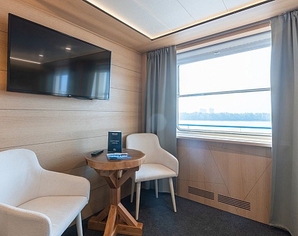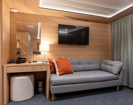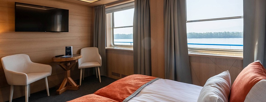 В каюте: две односпальные кровати (можно сдвинуть), диван, шкаф для одежды, холодильник, телевизор, фен, радио, сейф, два окна, электророзетка на 220V.