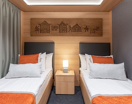 в каютах №101-118 — две односпальные кровати (можно сдвинуть), площадь каюты 17,7 м2;