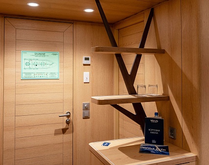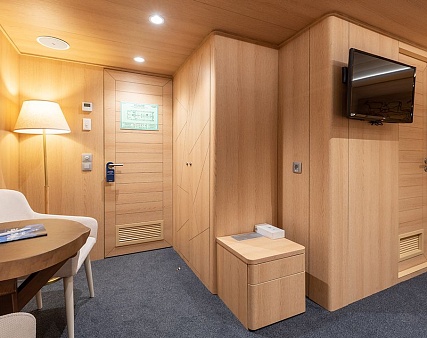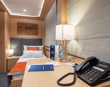 В каюте: односпальная кровать, шкаф для одежды, радио, кондиционер, телевизор, холодильник, фен, сейф, душ, санузел, обзорное окно, электророзетка на 220V.