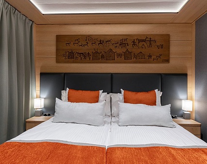в каютах №205, 206, 217, 218, 221, 222, 223, 224, 225, 226 — две односпальные кровати (можно сдвинуть), площадь каюты от 16,7 до 17,7 м2;