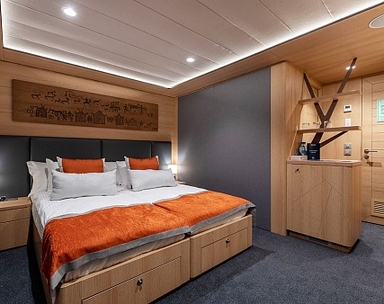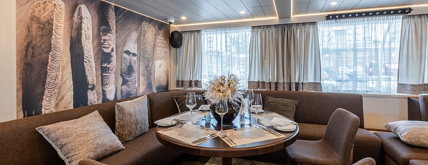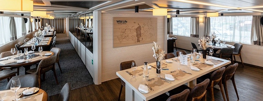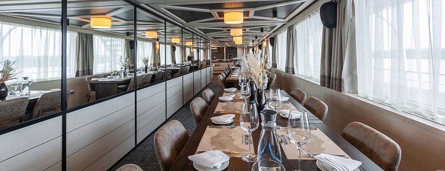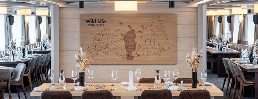 Экспедиционный круиз по Енисею на теплоходе «Максим Горький» — это возможность почувствовать себя ученым-исследователем и гостем роскошного отеля одновременно. Все сервисы и развлечения на борту продуманы так, чтобы максимально погрузить наших гостей в культуру и историю енисейского региона: от ресторанов с аутентичной местной кухней до сибирского банного комплекса с услугами СПА. Тематика каждой палубы соответствует географической зоне, через которую проходит Енисей: Степь, Тайга и Арктика. В дизайне использованы натуральные материалы и этнические элементы, которые отлично дополняют атмосферу экспедиции.