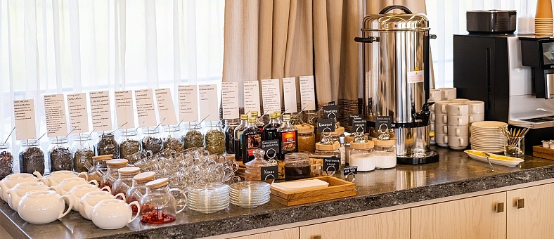 - Завтрак, обед – заказная система, фиксированная рассадка с элементами шведского стола (фрукты, десерты, соусы) и включенными напитками (вода, чай, кофе, домашний морс, сок) без ограничения;