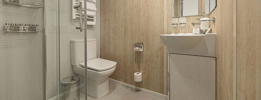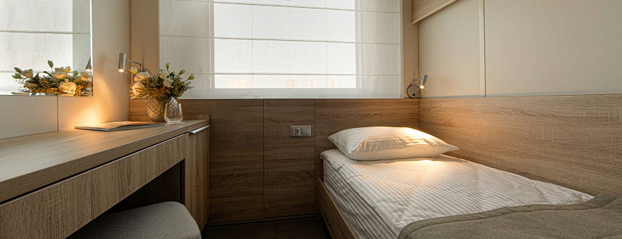 В каюте: одно спальное место, шкаф для одежды, радио, кондиционер, душ, санузел, холодильник, телевизор, фен, обзорное окно, электророзетка на 220V, площадь каюты до 7,7 м2.