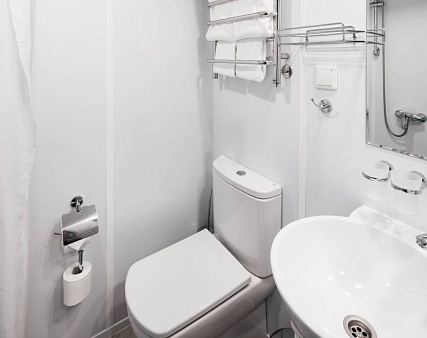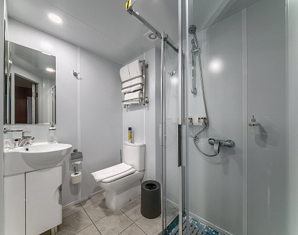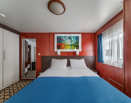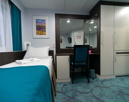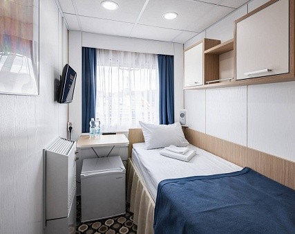 В каюте: одно спальное место, шкаф для одежды, кондиционер, радио, телевизор, холодильник, фен, сейф, обзорное окно, электророзетка на 220V, душ, санузел.