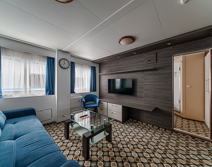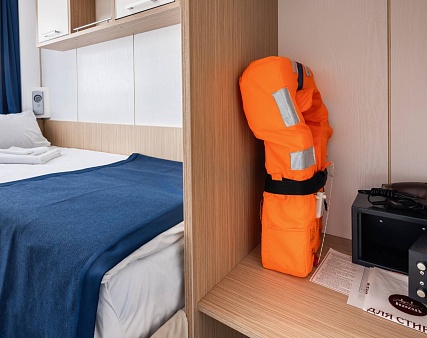 В каюте: три спальных места (два внизу, одно — вторым ярусом), шкаф для одежды, трюмо, кондиционер, радио, телевизор, холодильник, фен, сейф, обзорное окно, электророзетка на 220V.