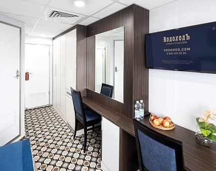 В каюте: два спальных места, шкаф для одежды, трюмо, кондиционер, радио, телевизор, холодильник, фен, сейф, обзорное окно, электророзетка на 220V.
