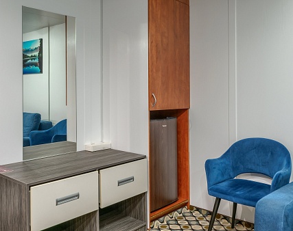 Комфортабельная гостиная с современным интерьером, мягкая мебель (два кресла, раскладывающийся на двух человек диван), журнальный столик, шкаф-стенка, кондиционер, радио, телевизор, холодильник, фен, сейф, два обзорных окна, электророзетка на 220V.
