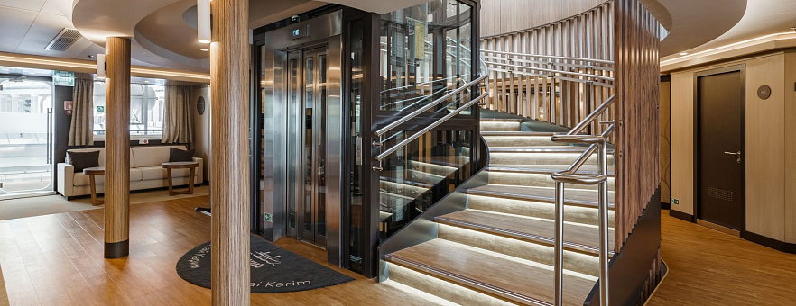 Теплоход «Мустай Карим» относится к классу «Водоход.Люкс». Путешествие на теплоходах класса «Водоход.Люкс» — это новый непревзойденный уровень комфорта в круизах по России. Отвлечься от будничной суеты, остановить мгновение и погрузиться в красоту окружающей природы уже сегодня может каждый путешественник на борту теплохода «Мустай Карим». Панорамные виды из каждой каюты, современные дизайнерские интерьеры, эксклюзивные экскурсионные программы в Выборге, Плёсе и Уфе, доступ к уникальным объектам и собственные гиды в городах по маршруту. Концептуальная авторская кухня и премиальный сервис уровня пятизвездочного отеля. Соотношение пассажиров и членов экипажа теплохода соответствует мировому уровню Люкс 2 к 1: на 309 гостей приходится 144 представителя команды. Старейшее в мире Британское Королевское общество корабельных инженеров (RINA – Royal Institution of Naval Architects) включило «Мустай Карим» в список 50 лучших судов 2020 года.