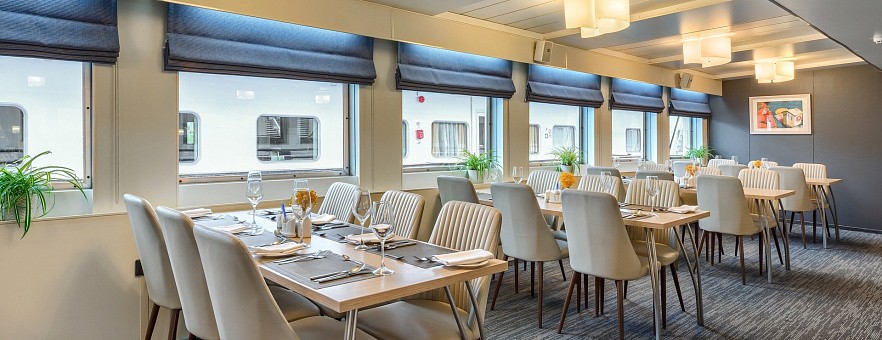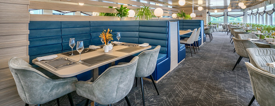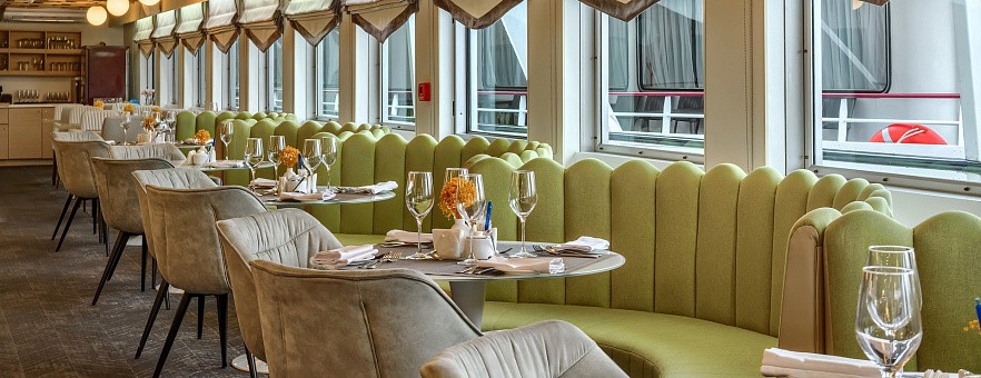 При разработке меню для ресторанов на борту наши шеф-повара вдохновлялись кулинарными традициями побережья Чёрного моря, Волги, Дона, озёрного края Северо-Запада России. Мы используем свежие локальные продукты, характерные для этих регионов, и предлагаем нашим гостям попробовать блюда, которые отражают гастрономические особенности народов нашей страны. Благодаря концепции «Родные берега», вы получите более полное представление о том месте, в котором находитесь, откроете новую палитру вкусовых ощущений и обретёте дружную компанию единомышленников.